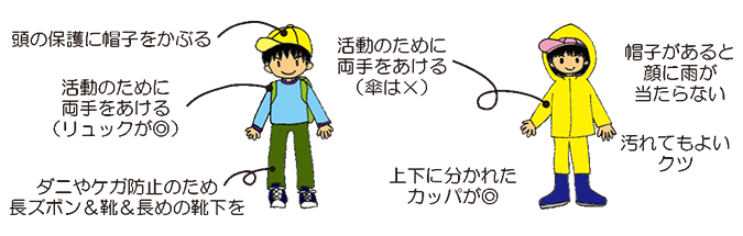 ・長そで、長ズボン、帽子、防寒着、雨具、濡れてもいい靴