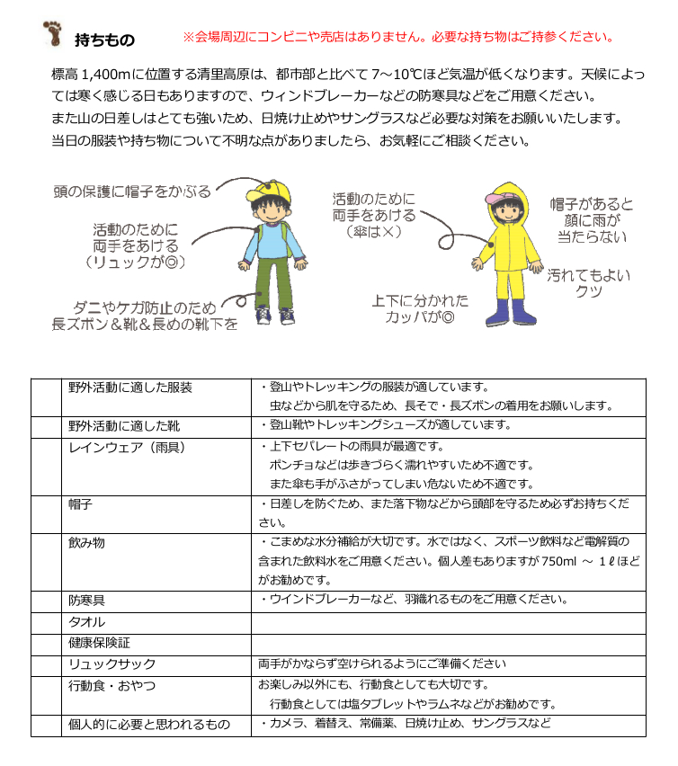 | 持ち物: | 防寒具・帽子・水筒・雨具(レインウェア及び傘)・宿泊に必要なもの | |