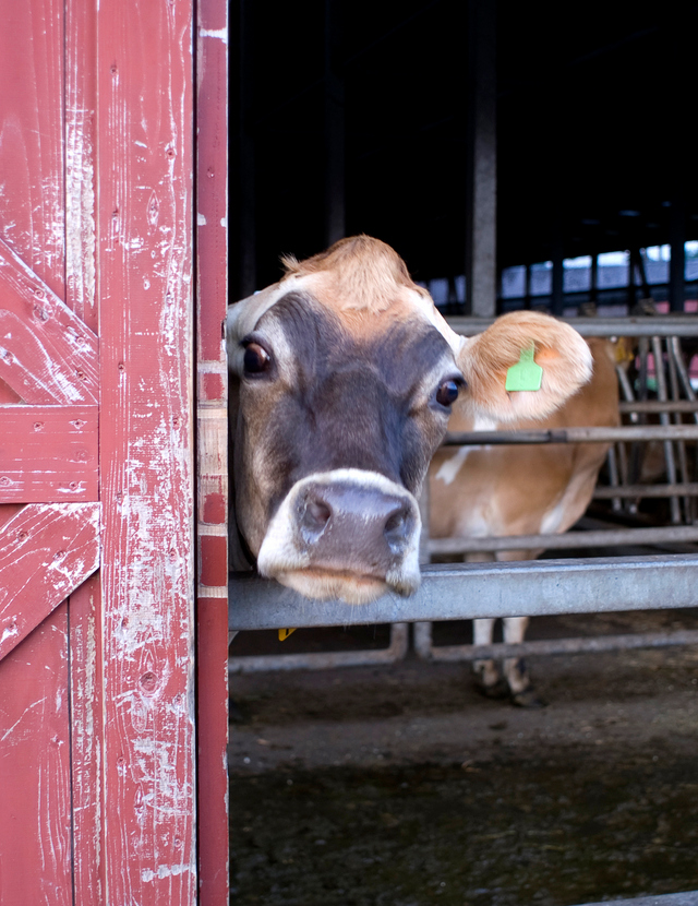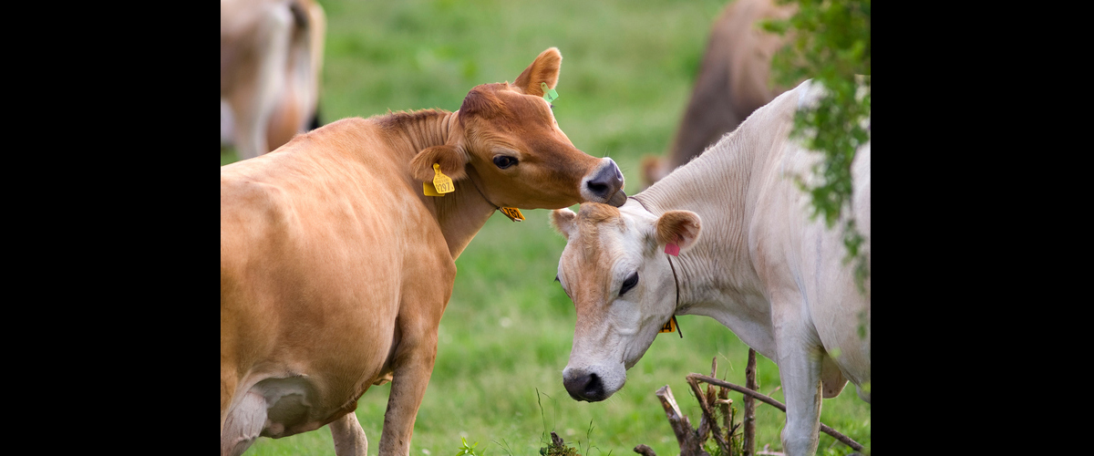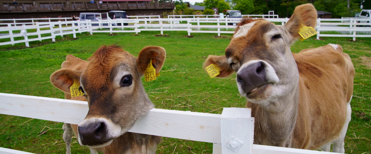 白黒の牛はホルスタインという種です。ジャージー牛はホルスタインに比べ体重は65%程度と小柄、温厚で人懐こい性格です。ジャージー牛から搾られる牛乳は、ホルスタインに比べ乳量は少ないですが、濃厚で栄養価の高いのが特徴です。