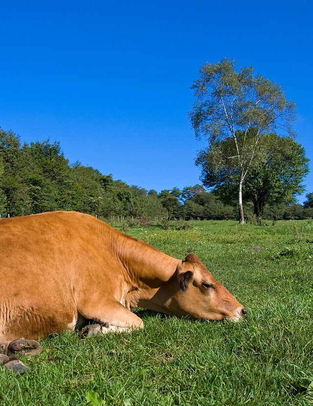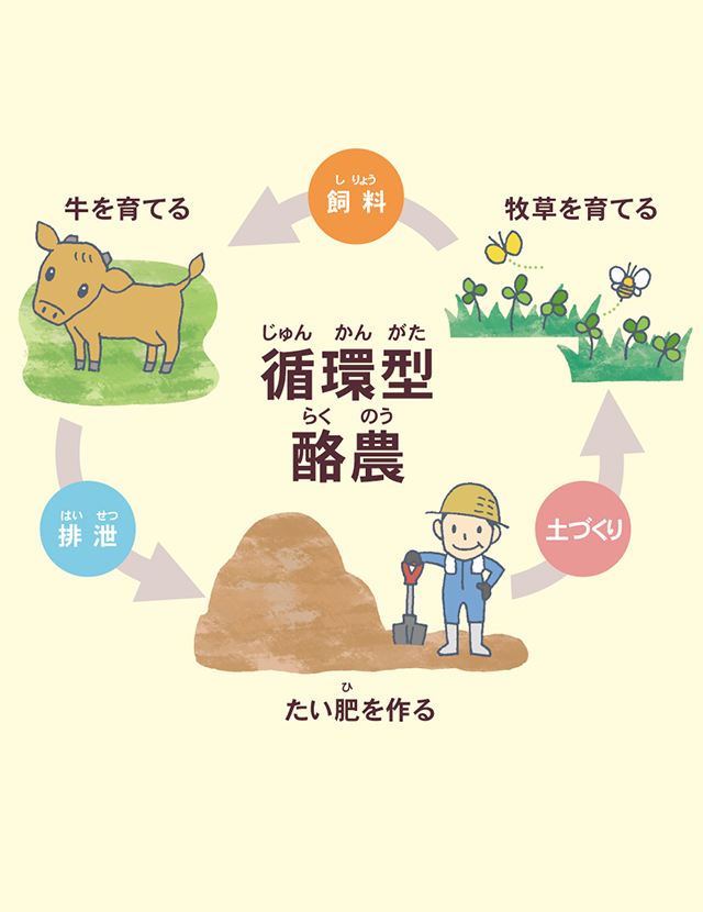 清泉寮ジャージー牧場には、東京ドーム15個分におよぶ広大な牧草地が広がっています。そこでは農薬を使わず、牛たちの糞でつくった堆肥を使い牧草を育て、その牧草を牛たちが毎日食べています。これを繰り返すことを「循環型酪農」と言い、のびのびとストレスなく暮らす牛たちからは、美味しくて安心な「人と地球の健康を考えた牛乳」が毎日搾られています。