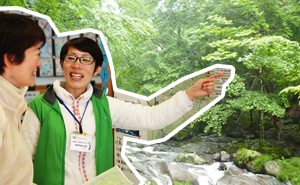 いよいよ森の入口です。ふれあいセンターには、旬の自然のみどころを教えてくれる展示がいっぱい。レンジャー(自然案内人)もいますので、気軽に声をおかけください。